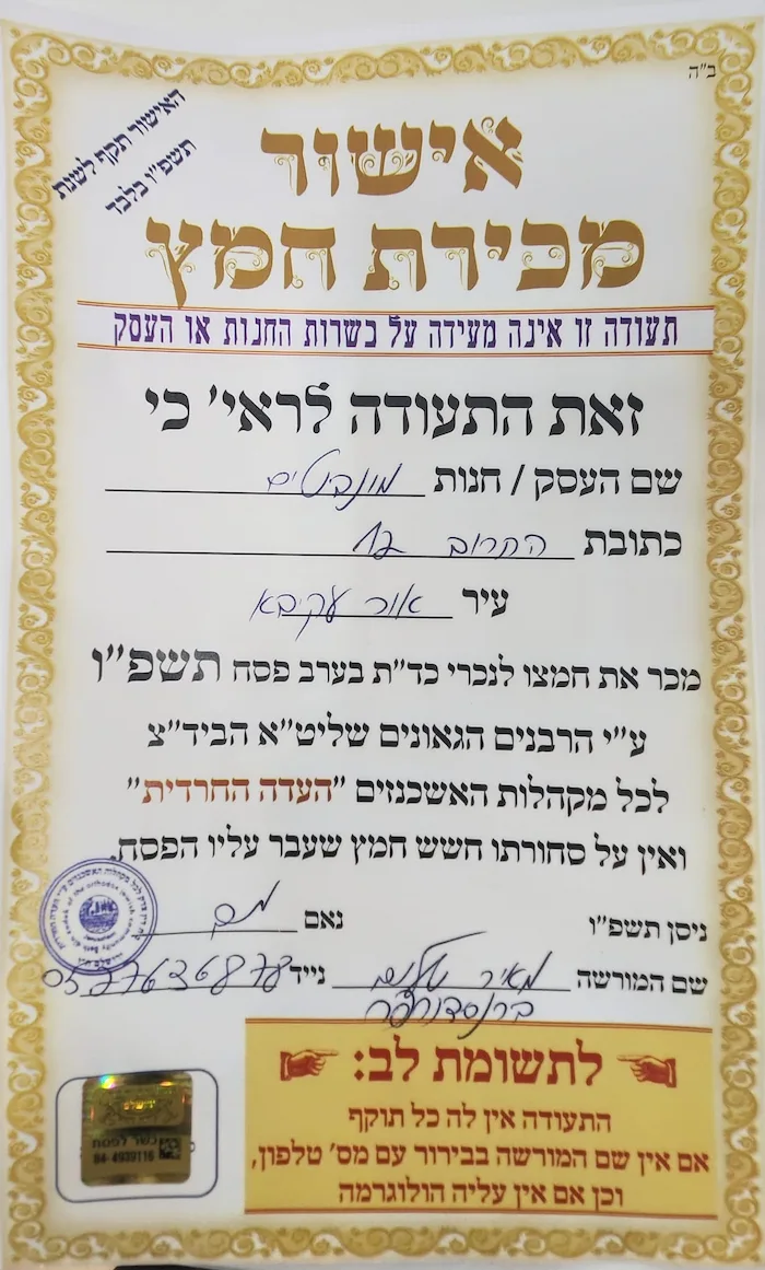 תעודת כשרות לפסח תשפ"ו